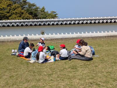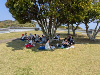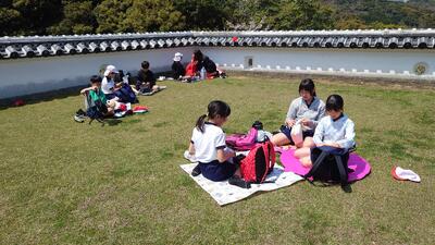 5年生のみなさんは、きれいな白壁の長塀の前でお弁当タイム。