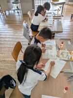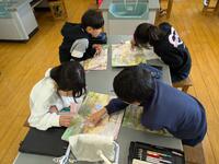 2年生は、1年生と行う学校探検の準備中です。一人何枚も担当しているので、てきぱき集中して作成していました。