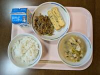 最後に今日の給食です。千草焼、五目きんぴら、春キャベツの味噌汁でした。おいしくいただきました。