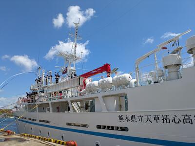 今日は、1,2年生が交通教室と兼ねて、熊本丸の出航式に参加の予定でした。登校の際は1・2年生もとても楽しみに話してくれました。しかし、式典はマリン校舎の体育館での実施となったため、1・2年生は交通教室を実施し、私だけが参加させていただきました。出航の際は青空が広がり、2週間の航海へ出発しました。この青空が前途を祝している気がしました。