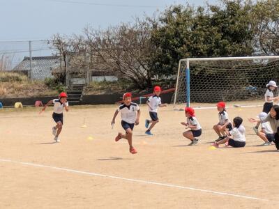 3・4年生が赤白対抗でリレーを行っています。その前にはバトンパスの練習も行っていたようです。