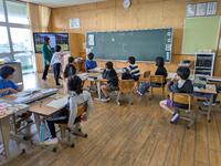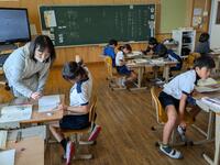 5年生は、自分の名前を使って作文づくり。たとえば、「き」「ば」だったら、「きくばり上手で」「バカンス大好き」など思い思いに書きながら、思い付かなかったら地球儀なども見てひねり出します。