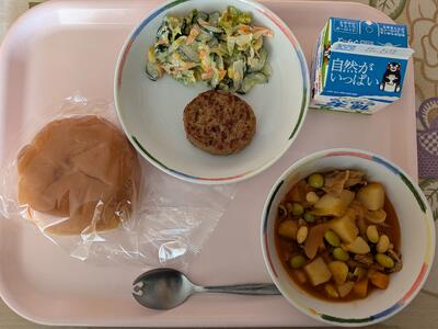 さて、今日の給食はこれ。セルフバーガーにミネストローネ、シーザーサラダです。おいしくいただきました。
