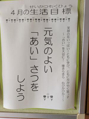 今月の生活目標です。『元気のよい「あい」さつをしよう』「あいさつ」を「あい」とカギ括弧でくくってくれたのは、担当の先生の「合い」「合う」を大切にという私の話を受けてと思います。