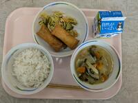 最後に今日の給食はこれです。のっぺい汁、白身魚の甘酢あんかけ、ちくわときゅうりのあえものがおかずでした。今日もおいしくいただきました。