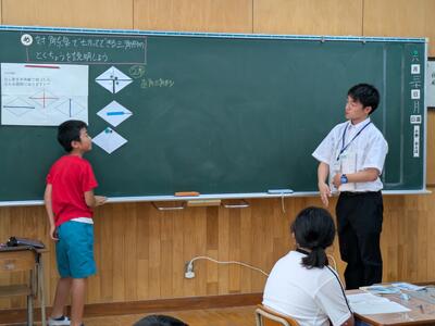 4年生は算数。ひし形の特徴を調べていきます。実際にひし形を切り取り、対角線で切って考えます。