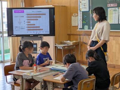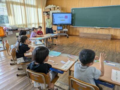 4年生は、算数の時間です。今日は「長さを違う単位で表すとどうなる?」です。「例えば3456mは何km?」などの問題です。