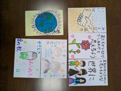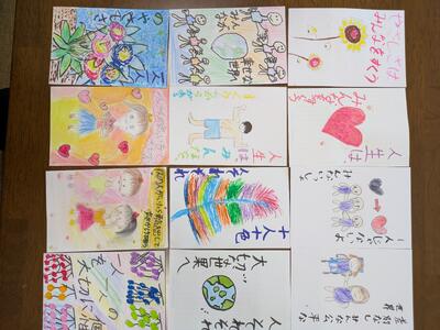 その5年生が作成してくれた「障がいのある人もない人も共に生きる社会」をテーマにした絵手紙です。