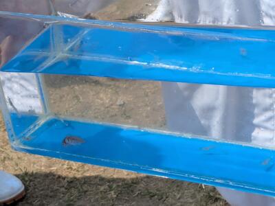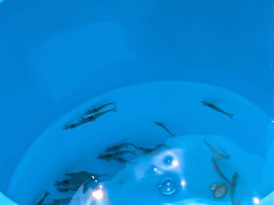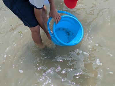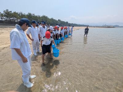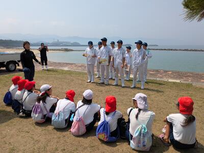 こちらは5年生。天草拓心高校マリン校舎のご協力でマダイとクルマエビの稚魚稚エビ放流です。