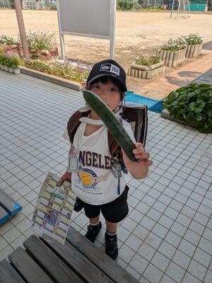 2年生が帰る時に「校長先生さようなら」といつも大きな声で挨拶してくれます。今日は収穫したキュウリを見せてくれました。「おいしそう〜♪」