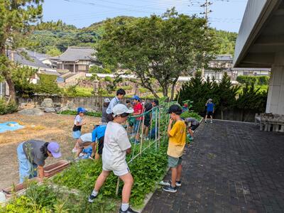 今日の朝タイムはクリーンタイムでした。34年生と一緒に花壇の草引きをしました。