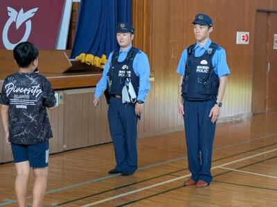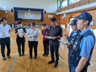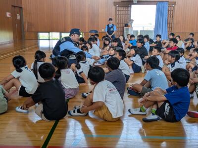 今日の2時間目は不審者対応避難訓練でした。苓北交番から指導に来ていただきました。子どもたちに対話をしながら、身を守る方法や大事なことを話していただきました。