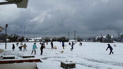 子どもたちは、朝から大はしゃぎ。寒さを忘れ、雪遊びです。担任の先生もいっしょに加わりました。おかげでくつはびしょ、びしょ。いい体験になりました。