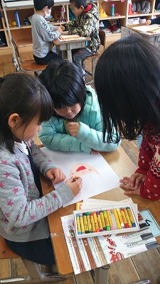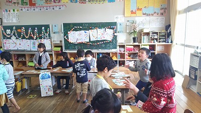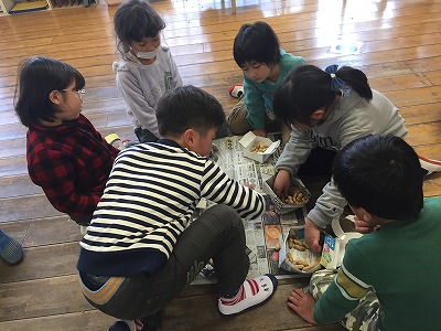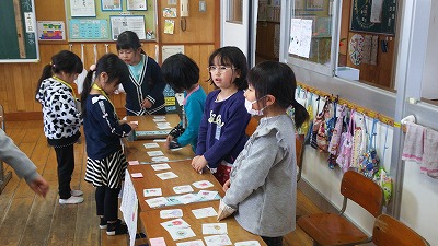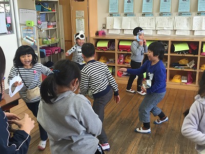 1,2年生は合同で行いました。1年生のお面はかわいかったですね。こちらは落花生で投げました。後で、数えてみんなで分けました。いっしょに算数の勉強です。
