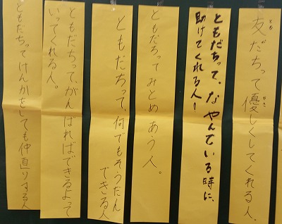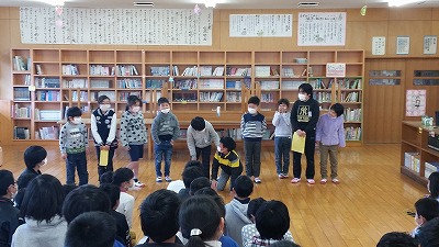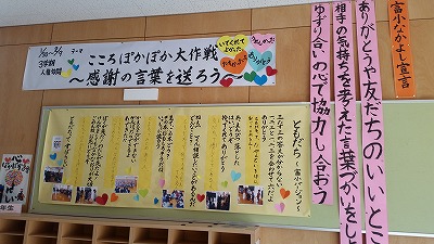 なかよし集会で、富小なかよし宣言を発表しました。アンケート結果、そして代表委員会を経て決定しました。2月7日がいじめゼロ、みんな仲よく生活していく新たな出発点だと確認したところです。翌日には、昇降口に掲示されたものをメモしている子どももいました。