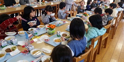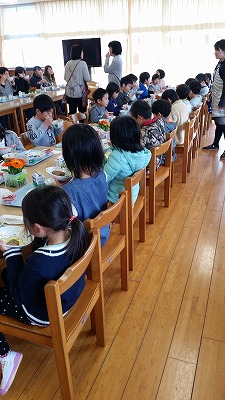 今日は新一年生の体験入学で、いっしょに給食試食会を行いました。新1年生も現1年生も相乗効果でみんなおいしそうに食べました。野菜はどうだったかな?