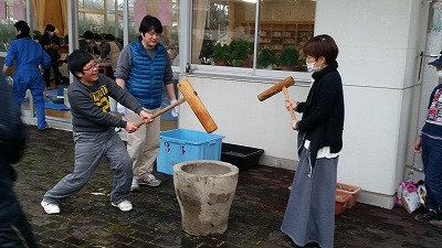 子ども育成会恒例行事「お別れもちつき」。天候を心配していましたが、なんとか親子もちつきまでもってよかったです。体育館でのもち投げも声が響き、もちも拾いやすかったですね。つきたてのもちを帰ってからも食べられたのではないでしょうか?