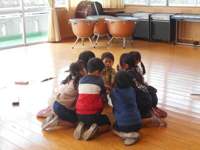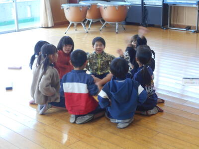1年生の様子です。最初はグループに分かれて、その後は全員で「♪おちゃらか」です。