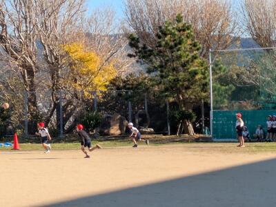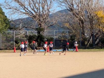 昨日の午後の様子です。風が冷たくて強い中、3・4年生が分かれて体育中です。