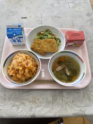 今日の給食は、チキンライス、フィレオチキン、レタスのコンソメスープ、カラフルサラダ、クリスマスケーキです。