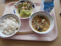 今日の給食はほうれん草餃子と棒々鶏サラダ、そして平麺スープです。美味しく頂きました。