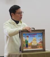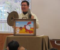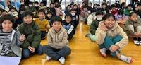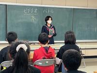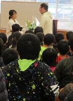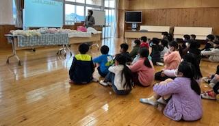 12月1日(金)、元KKTアナウンサーで、現在、フリーアナウンサーとして活躍されている本橋馨さんに、本校多目的室で全校児童に読み聞かせをしていただきました。「おじじとおばばの三つ子山」,「花さき山」、「ちからたろう」の三つのお話。「おじじとおばばの三つ子山」は、本橋さんオリジナルの紙芝居。予想しないストーリー展開に、職員も子供たちも大笑いでした。一転して、「花さき山」は、本橋さんの語りに引き込まれ、静かに集中して聴きました。子供たちの本橋さんへのお礼の手紙の中の一部を紹介します。「心に残ったことは、物語の中で、楽器を使っていろいろな音が表現されていたことです。いろいろな音があることで、物語の中に引き込む読み方がすごいと思いました。」、「シンバルとかはりせんの大きな音がびっくりしました。おばばが川で水遊びをして桃が出てきて、家に持って帰って切ったら桃太郎ではなくどんぐり太郎だったのが面白かったです。」、「本橋さん、すごいなと思いました。理由は、そのときの気持ちの表現や感情の出し方がすごいなと思ったからです。いろいろな楽器や声の大きさの出し方がすごいなと思いました。」