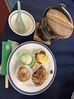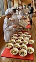「ご飯,雑煮,鰯生姜煮,紅白なます」 「清潔に心掛けての配膳」