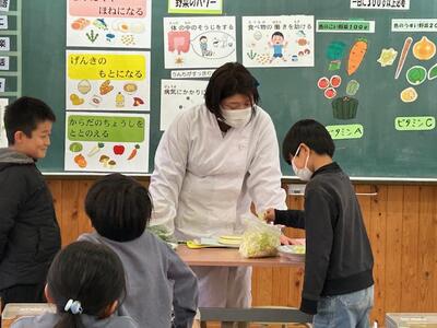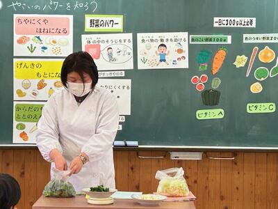 今週は、給食週間。「学校給食について理解し、感謝の気持ちを育てる」、「給食の先生方との交流の機会を設定する」という目的の下、栄養教諭の先生をゲストティーチャーとしてお迎えし、食に関する学習をしました。各学年の学習内容は、1年生「たべものとなかよくなろう」、2年生「朝ごはんをしっかり食べよう」、3年生「野菜のパワーを知ろう」、4年生「おやつのひみつをさぐろう」、5年生「カルシウムの働きについて知ろう」、6年生「一食分の食事について考えよう」です。これらの学習のほかに、給食の先生方へ、手紙や作文、寄せ書き、絵などで、感謝のメッセージを贈ります。また、給食委員会の子供たちが、献立の紹介をするとともに、児童集会で給食週間についてや給食クイズなどの発表をします。