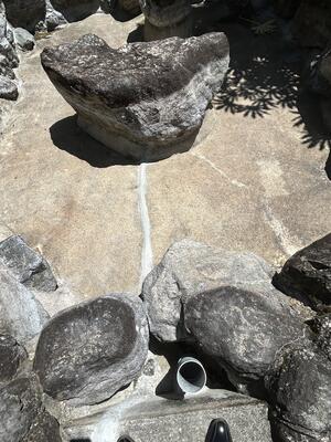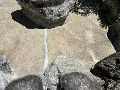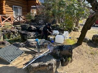 水位が下がっていたので、その都度、水を継ぎ足し継ぎ足ししていたのですが、魚を別の池に一時的に移して、ゴールデンウイーク中に、池の水を全て抜き補修をしていただきました。現在、補修したところを乾燥させているところです。補修が上手くいって、魚が泳いでいるところを見られるよう願っています。