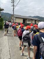 前日に雨が降り、送別遠足に出かけることができるかどうか心配していたのですが、当日は、肌寒さはありましたが、それぞれのコースを縦割り班ごとで歩いてチェックポイントで宝を獲得し砥用ドームまで行きました。送別遠足の前に、体育館で6年生とのお別れ会をしました。お別れ会では、シルエットクイズ(6年生と2人の先生が、それぞれヒントとなるバレーボールや剣道の竹刀、地球儀等を持って動くシルエットから、誰かを当てるクイズ)と、各教室に隠れている学年代表児童を探すかくれんぼをしました。5年生が中心となって企画し、6年生にアドバイスをもらいながら準備を頑張り実行しました。5年生が何度となく校長室にプレゼンに来ました。とても楽しい盛り上がった「6年生を送る会」と「送別遠足」になり、子どもたちの頑張りに感心しました。