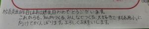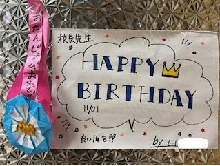 誕生日翌日の朝、出勤すると校長室の入り口に「HAPPY BIRTHDAY」のメッセージカードがはってありました。朝のルーティーン(駐車場と通学路の枯葉掃き)を終えて校長室に戻っている途中、待ち構えていた子供たちから「誕生日、おめでとうございます」の声。そして、「ハッピバースディ~♪」の歌。手作りメダルと拍手をもらいました。また、やってみタイムのプリントには「お誕生日おめでとうございます」のメッセージが。とっても、とっても、心が温かくなりました。