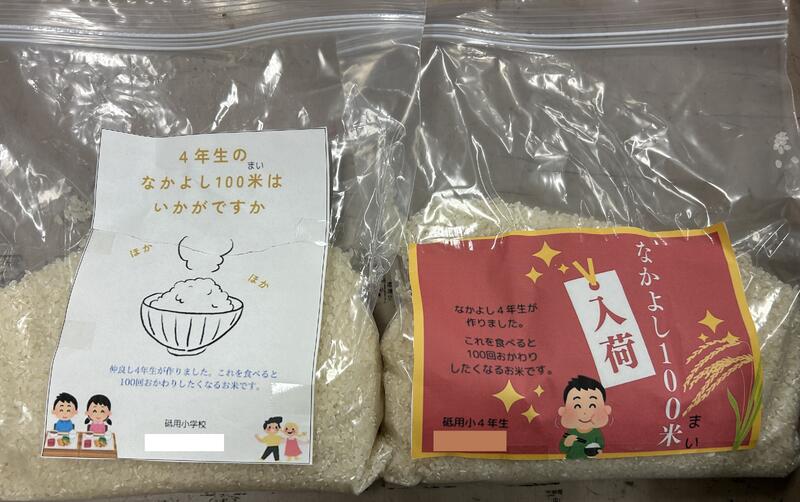 地域の方の協力で4年生が育てた「なかよし100米」、おいしかったです!二袋以上の購入を希望していた職員がいたので、職員に代わって4年生の子どもがくじを引き、見事、私が二袋購入することができました!子ども達から、このことを聞いて、「やったぁ!ありがとう」、お礼を言って、当選くじを引いてくれた子どもと両手で握手。