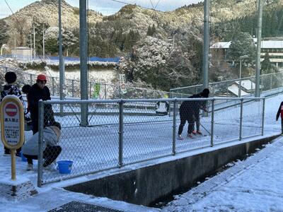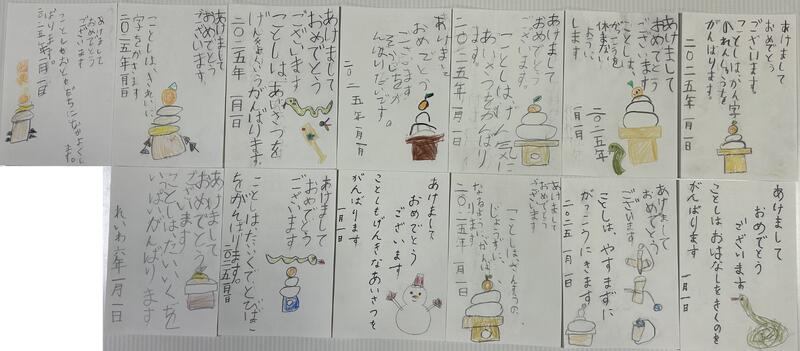 校舎周辺を見て回った後、職員玄関で靴を脱いでいると、なにやら子ども達の賑やかな声がします。「あれ?授業中だよね」と思いながら校長室へ行こうとすると・・・。校長室前廊下に、担任や支援員と一緒に1年生の子ども達が待っていました。なんと、一人一人、順番に年頭のあいさつをするとともに、今年頑張りたいことを話してくれ、年賀状をもらいました。3学期初日から嬉しい「お年玉」をありがとうね!