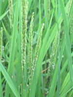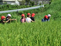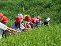 4年生がイネの生長を観察しにいきました。子供たちの胸のあたりまで丈が伸び、1m以上ありました。また、白くて小さいイネの花が咲いていて「これが花か~」「初めて見た~」とびっくりしていました。