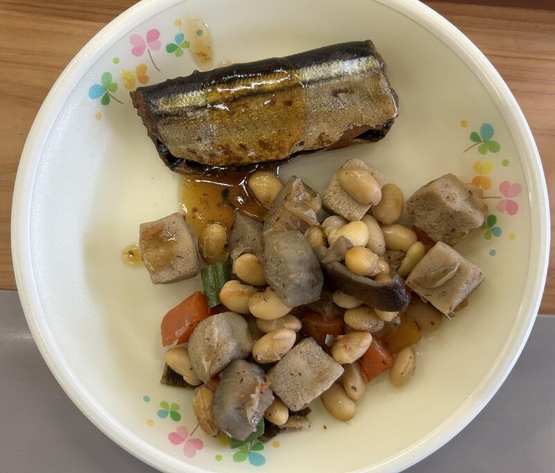 宇城地区の企業の砥用支店から、SDGs活動の一つとして、かぼちゃと大豆をいただいていました。今日の給食で大豆を調理した「五目豆」を食べました。おいしかったです!写真にあるのはサンマ甘露煮です。