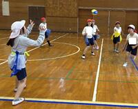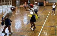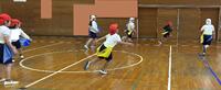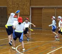 3年生の体育、体育館でタグラグビーをしています。体育館に行くと、ちょうどゲームをしているところでした。それぞれのチームで、互いに声を掛け合い協力してゲームをしていました。どの子どもも一所懸命にボールを追い、白熱したゲームが繰り広げられていました。見ていて笑顔になりました!