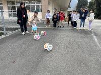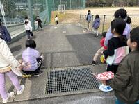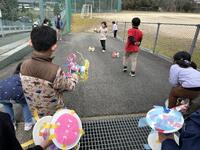 出張から帰ってくると、1年生が、運動場への坂道で、たくさんの飾りつけをした作品をもって勢揃い。何をするのだろうと思って、慌てて出て行ってみると、坂道で転がして遊んでいました。飾りつけがひらひらときれいに動き、また、坂道の一番下まで転がっていく様子を見て、大喜び。子どもたちは、自分の順番が来るのが待ちきれない様子でした。