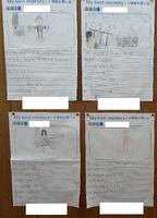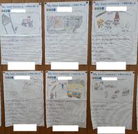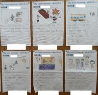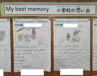 6年生が、小学校の思い出を英語で発表しました。①~⑤「①~に行きました。②~を楽しみました。③~を見ました。④~を食べました。⑤~かったです。(感想)」の順番で発表しました。多目的室へ行く階段踊り場に掲示してあります。