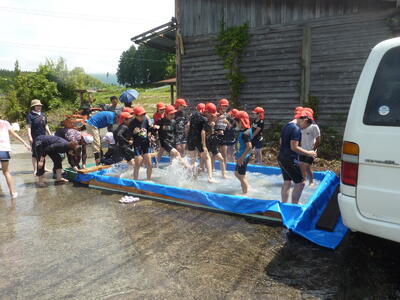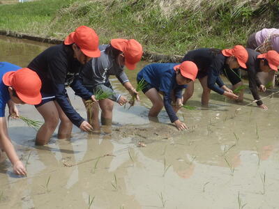 雨天で気温も低かったため、一日延期しての田植え。当日は、前日が嘘のように晴天。保護者の方々に協力いただいて、無事、終了することができました。田植えにかかった時間は、なんと、30分間。最初、田んぼに入るときこそ歓声が上がっていましたが、いざ、苗を植え始めると、早い、早い。しかも、浮いてくる苗なし。上手でした。終了後は、泥落としに用意していただいたミニプールで水遊びをすることができました。