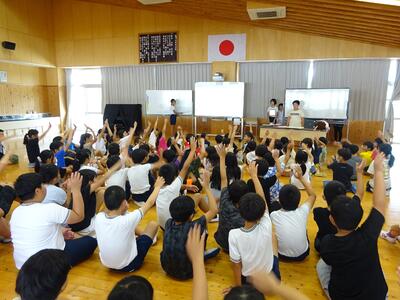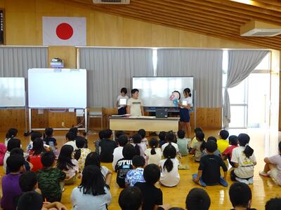 6月23日(金)児童集会で、保健委員会の子供たちが「歯の働きとむし歯予防」について、クイズあり、ミニコントありの発表をしました。聞いている子供たちは、発表に釘付け!とても熱心に聞き、感想もたくさん発表することができました。