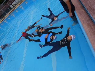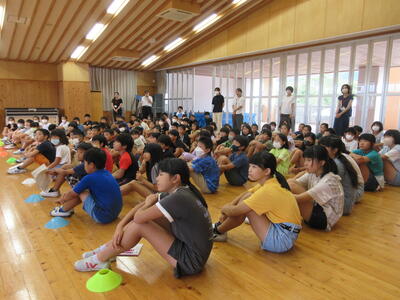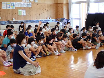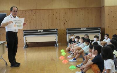 宇城消防署からおいでいただき、5,6年生が着衣泳の学習をしました。新型コロナウイルス感染症予防のため実施を見送っていたので4年ぶりの学習です。5,6年生は1,2年生のとき以来の学習になります。担任に学習の様子を聞くと「ブランクはあったが低学年で経験していたので、脱力して浮くことができていた」とのこと。それぞれに、ビート板や2Lのペットボトル、何もなしで「ぷか~」っと浮いていました。水の事故は命に直結します。着衣泳の学習をすることにより、緊急事態での対処を学ぶだけでなく、このようなことにならないよう安全に海や川で遊ぶ心構えを育てる良い機会になりました。