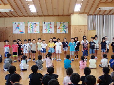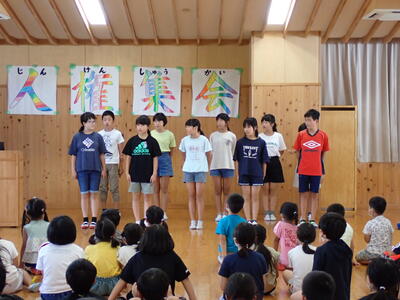 終業式では、2,4,6年生の代表が「1学期頑張ったことや思い出に残ったこと、夏休みに楽しみにしていること、これから頑張りたいこと」を堂々と発表しました。2年生;水泳で、けのびキックができるようになった。校長室の掃除を頑張った。夏休みは、虫の飼育と観察をしたりして、最高の夏休みにしたい。4年生;5,6年生に教えてもらいながら委員会活動を頑張った。聞いている人に分かるように、はきはきと言えた。水泳で25m泳げた。これからも諦めずに頑張っていきたい。6年生;運動会での出発係の仕事と人権集会でのスライド作りが楽しかった。緊張したけれど発表も上手にできた。これからも、しっかり振り返りながら頑張りたい。発表を聞いている子供たちも集中して聞いていました。明日からの夏休み、心身の健康に気を付けて元気に過ごしてほしいと思います。