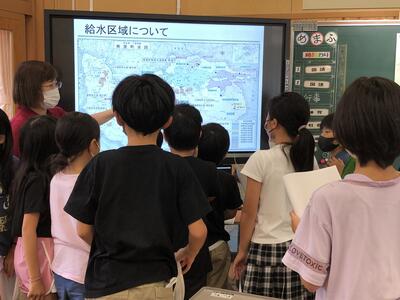 「私たちの家で使っている水はどこからくるのだろう・・・」。社会科の学習で美里町役場上下水道課から来ていただき学習しました。本来なら7月3日(月)に予定していた学習でしたが、この日は大雨。水源に濁りが出たために対応しなければならず延期になっていました。資料やプレゼンをたくさん準備し分かりやすく説明をしていただき、子供たちは意欲的に学習に取り組んでいました。