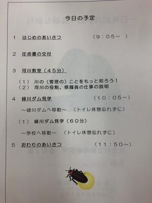 宇城地域振興局主催の1日河川パトロールの学習をしました。1日河川巡視員の任命書を交付していただき、管理事務の説明や河川と河川施設の役割の説明を聞いた後で緑川ダムを見学。エレベーターでダムの内部に入り、ダムが、どのような構造になっているのかも見学をして、貴重な体験ができました。川の役割3つ「利水,治水,環境」を、実感を伴って学習しました。