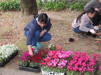 プランターを持参し、家族で花の苗を植えます。丁寧に優しく土を入れて苗を植えました。プランターに植えた花の苗の家庭でのお世話をよろしくお願いします。