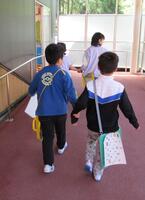 4月19日(金)2,3校時は、生活科の学習での学校探検。2年生が1年生を案内しました。2年生は、自分たちで、各場所の説明や1年生への配慮を考えたり、練習を一所懸命にしたりして、当日は、手をつなぎながら案内しました。案内が終わったあとも、1年生のワークシートの書き方を寄り添って教える等、先輩としての優しい心配りがありました。1年生は、校長室や職員室,保健室,事務室等へ入る時の挨拶の仕方を一人一人練習しながら入り、先生方に自分で作った名刺を渡して挨拶をしました。興味津々な顔と緊張した様子が印象的でした。