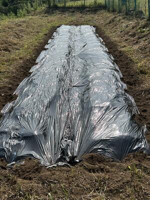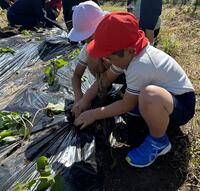 25日(土)朝から運動場に出て畑も見に行きました。すると・・・。昨日放課後、1,2年担任3人で、畝を作り黒マルチを張ったということでした。職員のチームワークの良さがあります。