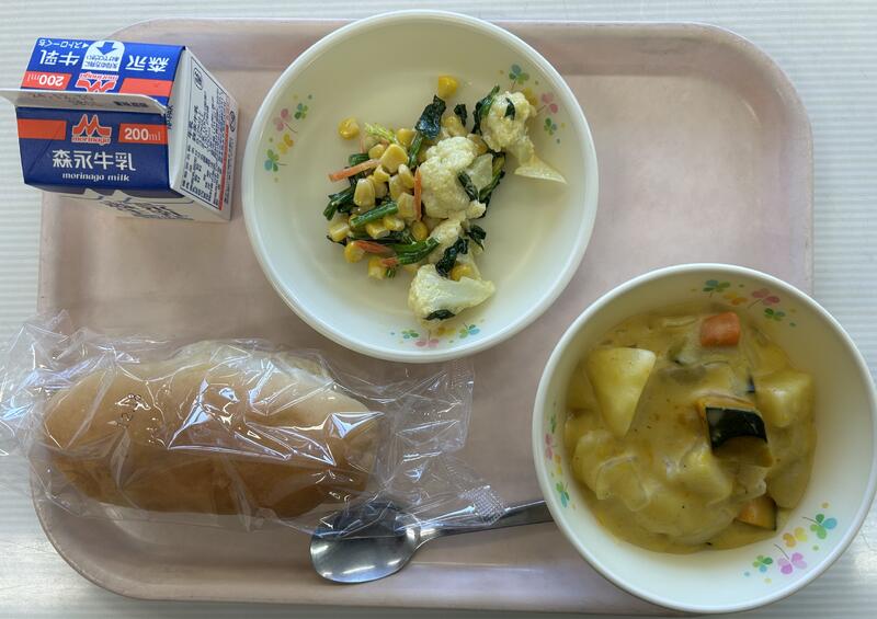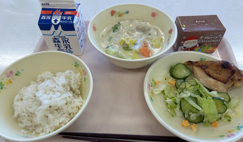 12月19日(木)今日の給食は、昨日、町から届けていただいた「美里かぼちゃ」を使ったかぼちゃのクリーム煮です。クリーム煮なので、あまり目立ちませんが、美里かぼちゃが、ごろっといくつも入っています。ほくほくして、甘みがあって、とてもおいしかったです。美里町は、おいしい食材がたくさんありますね!