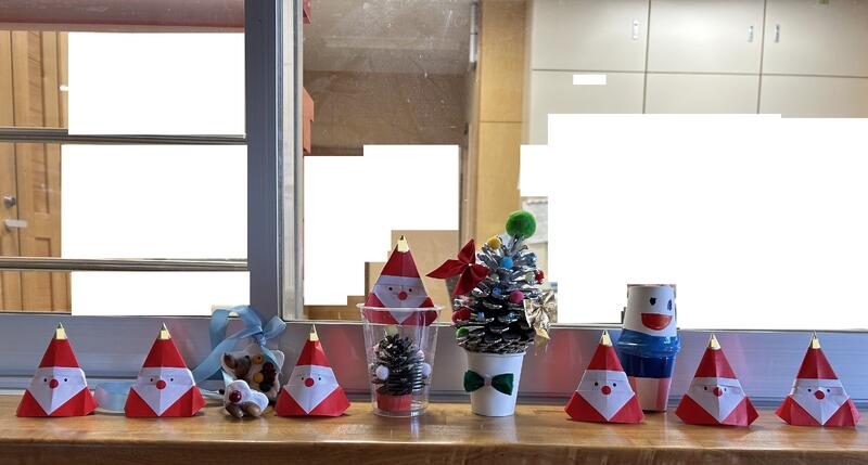 来賓・職員玄関の事務室前に、職員手作りのたくさんのサンタクロースと1年生が作ったツリー等が飾ってあります。いよいよ、明日、2学期の終業式。「子ども達」は25日(水)から冬休みです。