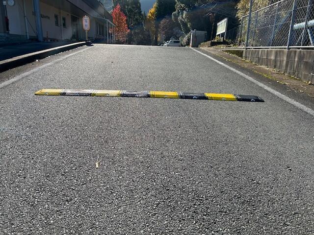 坂の途中に「徐行」看板を設置し、注意を促していますが、登坂ということもあって、かなりスピードが出た状態で上がってくる車があります。間違えて上がってきて、給食室前まで行き、すぐにUターンして下りていく車もあります。子ども達の学習(「季節ごとの植物や生き物を見つけよう」、「水泳」、「持久走」等々)や登下校、園児の散歩等と重なったらと心配していました。そこで、「減速帯」を設置しました。緊急時や子どものけがや病気での送迎等を除き、原則、学校への乗り入れは遠慮いただいています(体育館東側駐車場や信号機から入ってすぐにある駐停車スペース、砥用中学校体育館側駐車場の利用)が、もし、車で来校される際には、ご注意ください。